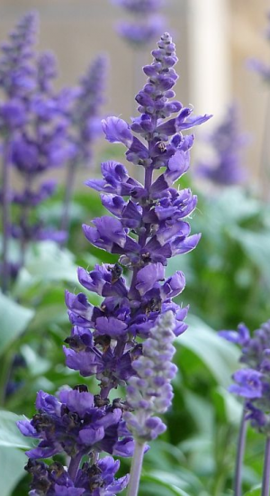 Рассада шалфея Blaukoenigin используется для озеленения. Растение среднее, с прямыми стеблями, длиной до 60 см, нижние листья имеют округлое основание и заостренную верхушку, морщинистые, верхние листья небольшого размера, сидячие, есть боковые ветви. Цветки мелкие, фиолетово-синие, собраны в соцветия, венчик синий. Период цветения: июнь-сентябрь.Саженец шалфея Blaukoenigin прекрасно переносит зиму, если посажен в хорошо дренируемую почву. Растение декоративно, привлекательно смотрится даже после цветения, используется в садах, розариях, в качестве фона для роз.
