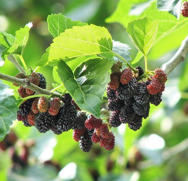 Саженцы шелковицы Смуглянка характеризуются обильным плодоношением. Дерево высокое, 15 м, обладает широкой кроной, крупными несимметричными листьями. Крупный плод, 3см, черного цвета, сочный, сладко-кислый, без запаха, напоминает по внешнему виду ежевику, но более крупный. Плодоношение обильное, период созревания – конец июня. Дерево может развиваться на любой почве, используется в декоративных, пищевых целях, плоды предназначены для народной медицины. Ягоды полезны при заболеваниях сахарным диабетом, гипертонией.