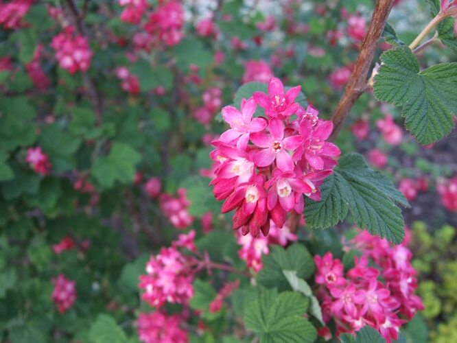 Смородина Pulborough Scarlet - украшение весеннего сада, цветущая смородина — надежный и легкий в выращивании кустарник. Повисающие кисти темно-красных цветков сменяются со временем округлыми сине-черными ягодами. Период наибольшей декоративности поздняя весна, лето. Высота - 3 м, ширина - 2,5 м.
