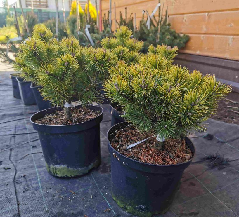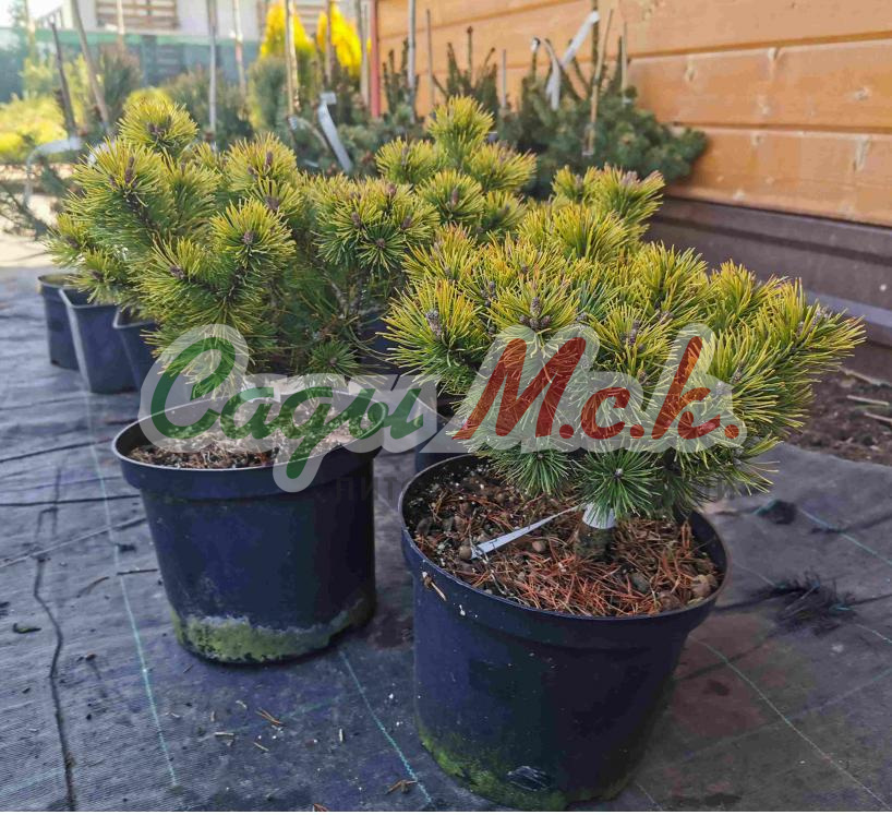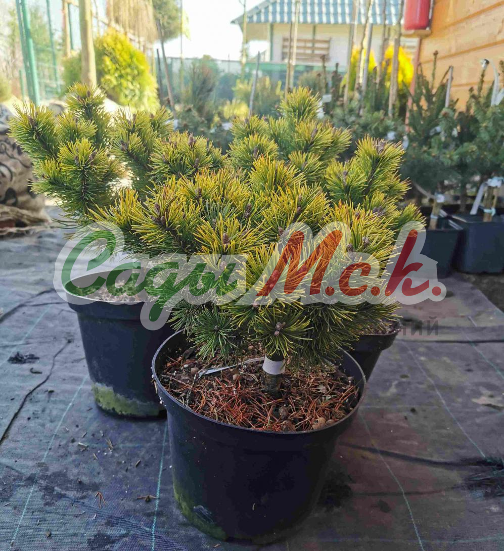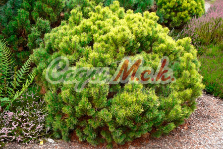 Сосна горная Офир – это еще одно хвойное карликовое растение, которое элегантно меняет летний окрас ярко-зеленой хвои на лимонный осенью и золотисто-желтый зимой. Этот медленнорастущий плотный шарик с сюрпризом вырастает в 20-летнем возрасте всего лишь до 0,8м в высоту и 1м в диаметре. В более зрелом возрасте шарик трансформируется в широкий конус или кеглю. Форма этой малютки часто бывает причудливой, что не портит ее, а лишь придает пикантности. Жесткая, колючая, короткая, прямая хвоя собрана в пучки по две хвоинки, бывает размером не более 3см.