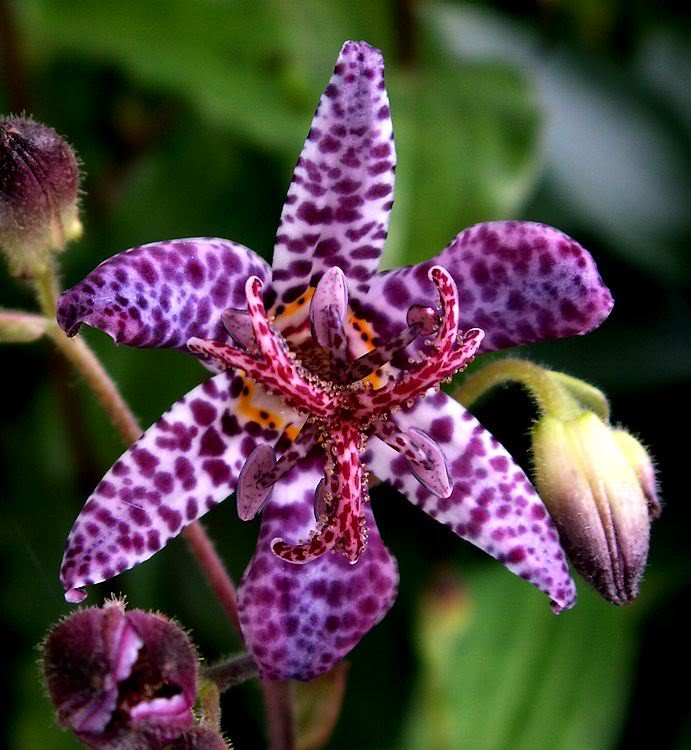 Tricyrtis Purple Beauty - невысокое многолетнее растение. Листья кожистые, темно-зеленые. Цветки редкие, эффектные. Лепестки окрашены в белый цвет, отличаются светло-фиолетовым оттенком и фиолетовыми пятнами. Сердцевина бело-красного цвета, состоит из наполовину сросшихся пестиков.