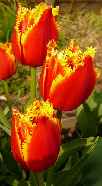 Тюльпан Davenport - сорт среднепоздний, густо-бахромчатый. Высота цветоноса 55 см. Листья зеленые, однотонные, не широкие. Цветок крупный, бокаловидный, с желтым дном и темными пыльниками. Высота бокала 8 см, диаметр - 6 см. Лепестки бокала с внешней стороны - терракотово-красные, с ярко-желтой бахромой, а с внутренней - ярко-желтые, с пламенно-красной, широкой полосой посредине лепестков. Цветение начинается в конце мая.