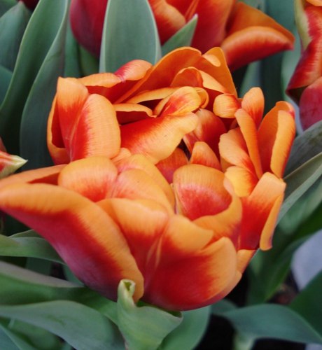Тюльпан Pebble - двухцветный, поздний сорт. Высота растения 40 см. Цветоносы крепкие. Листья темно-зеленые. Цветок крупный, чашевидный, густо-махровый, пионовидный, пламенно-красный, с оранжевыми краями лепестков. Цветет в мае. Размер луковицы - 11/12 см.