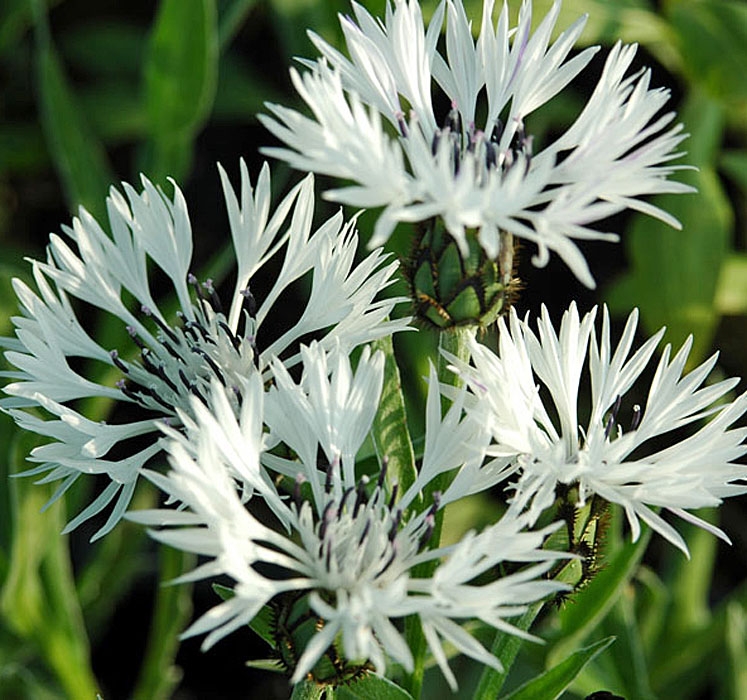 Василек – неприхотливый многолетник. На конце стебель имеет ярко-белые одиночные соцветия. Стеблевые листья вытянутой овальной формы. Растение отлично приспосабливается к неблагоприятным условиям