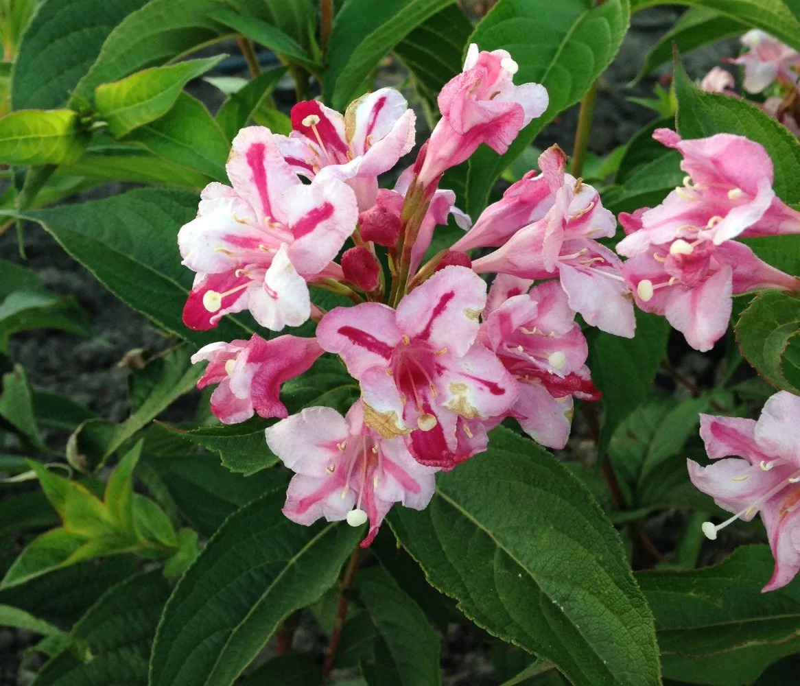 Гибрид между вейгелой цветущей и вейгелой корейской. Раскидистый кустарник до 2м высотой и до 2,5м шириной. Цветки очень крупные с колосовидным отгибом, розовые, слегка пестрят белым, обильно появляются на кусте в июне месяце. Листья светло-зеленого цвета, осенью краснеют. Этот сорт зимует лучше всех других, ему требуется лишь небольшое укрытие листом. Любит солнечные места, плодородные дренированные почвы.