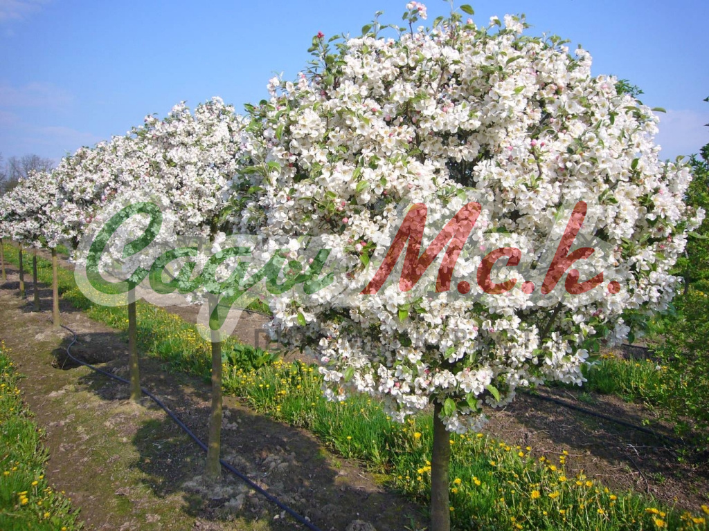 Саженцы яблони декоративной Голден Хорнет из семейства розовых, относятся к декоративным яблоням. Дерево такого сорта очень быстро вырастает, корна формируется густой и широкой. Ветви прямые, листва насыщенного зеленого цвета, осенью они желтеют. Крупномер цветет в мае, его соцветия простые одиночные, бутоны светло-розового цвета. Осенью дерево покрывается мелкими плодами золотисто-желтого цвета, они долгое время висят на ветвях, не опадая даже зимой. Яблоки этого сорта можно использовать для домашних заготовок, сама яблоня будет являться отличным декоративным украшением. Саженцы Голден Хорнет неприхотливы и хорошо растут на любой почве.