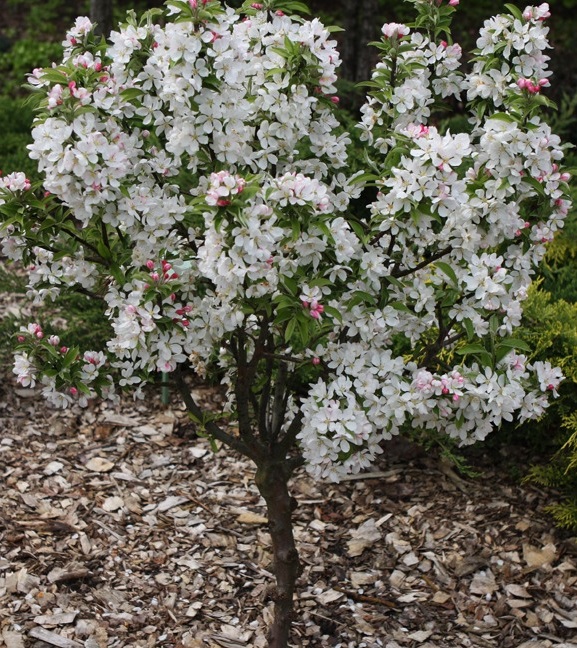 Одна из самых интересных декоративных яблонь: цветение обильное и производит множество мелких оранжево-красных яблок, которые остаются на дереве в течение длительного времени после того, как листья опадают.