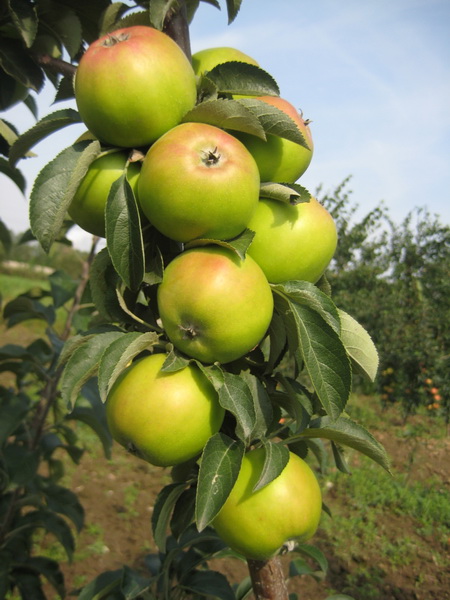 Саженцы колоновидной яблони ЛУКОМОР принадлежат к скороплодным, зимостойким сортам. Дерево низкорослое, достигает до 2 м в высоту, формирует компактную крону с тонкими ветвями и густой листвой. Плод средний, массой 120 г, с ярко-зеленой окраской. Мякоть сочная, ароматная, с небольшой кислинкой.