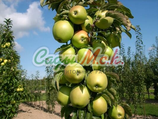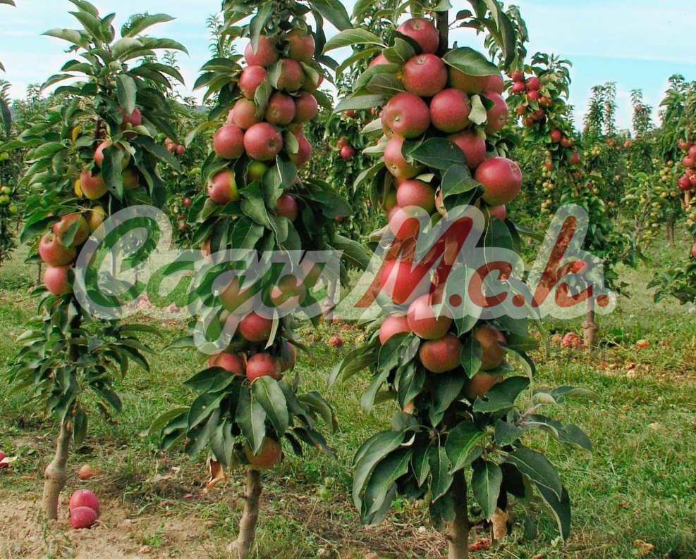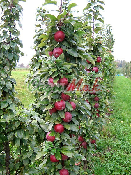 Саженцы колоновидной яблони ТРИУМФ принадлежит к зимостойким сортам. Дерево компактное, с аккуратной кроной, ветви тонкие, листва темно-зеленая, густая. Плодоношение наступает на 3 год после посадки. Плод средний, массой 150 г, шаровидной формы, красного оттенка с полосками, глянцевый, с плотной кожурой. Мякоть ароматная, ксило-сладкая на вкус, мелкозернистая.