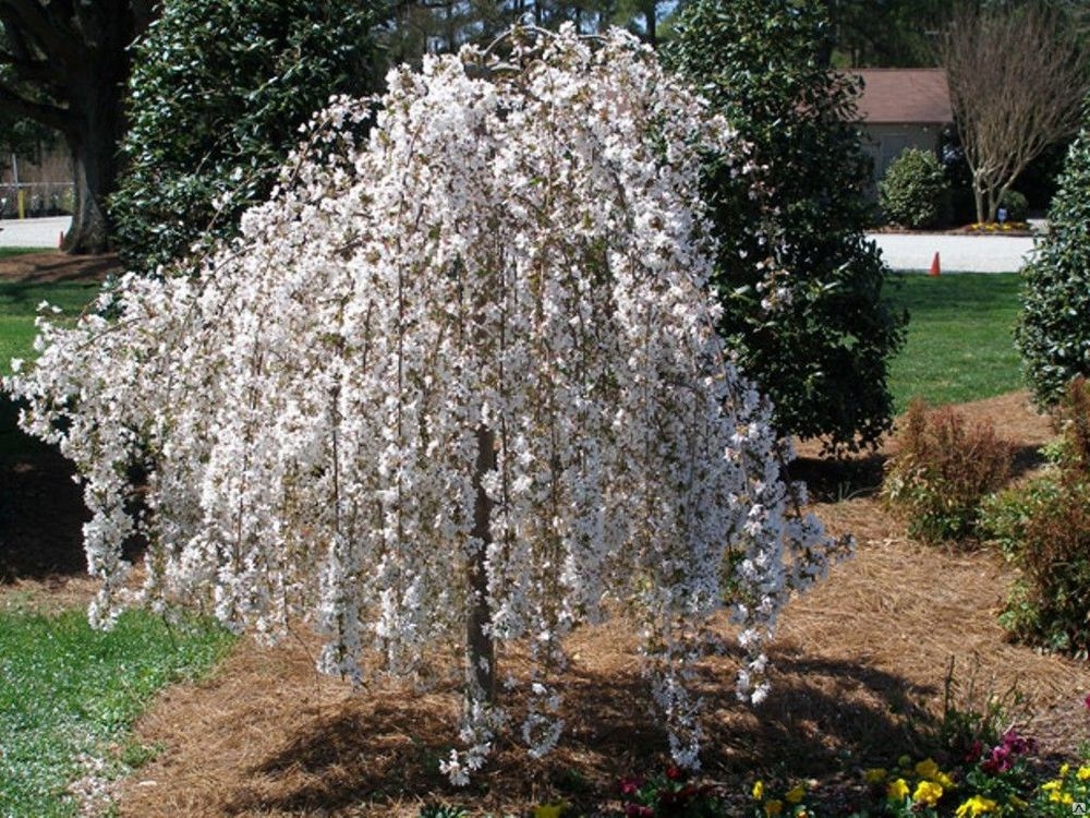 Крона округлая, ветви и побеги плакучие, свисающие до земли. Листья эллиптические, удлиненные, с более или менее заостренным кончиком, зеленые. Черешки и нижняя сторона волосатые. Цветы белые с легким покраснением на внешнем диаметре, 3-4 см. Цветет обильно в середине мая. Плоды небольшие, сферической или слегка удлиненной формы, около 1 см в диаметре, зеленовато-желтые с красным, иногда сильным румянцем