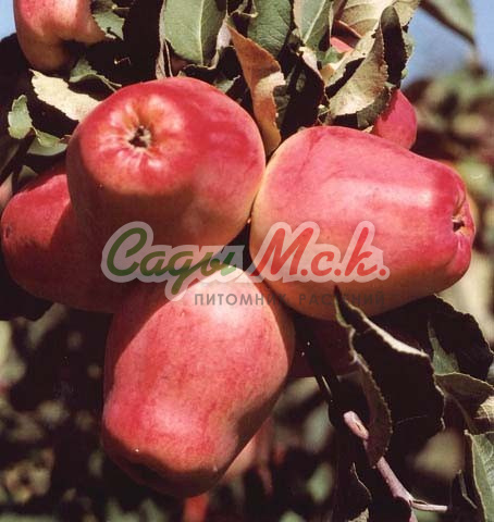 Саженцы яблони Зимняя красавица принадлежат к зимостойким сортам. Дерево среднерослое с округлой кроной, ветви прямые, длинные, листья ярко-зеленого оттенка, с опушением. Плод крупный, 175 г, конической формы, гладкий, с зеленоватой кожицей, покровный окрас в виде пурпурного румянца, подкожные точки отсутствуют. Мякоть средней плотности, сочная, мелкозернистая, кисло-сладкого вкуса. Крупномер яблони начинает созревать в позднезимний период, отличается длительным хранением плодов – до конца апреля. Преимущества: высокая зимостойкость, урожайность, вкусовые качества плода.