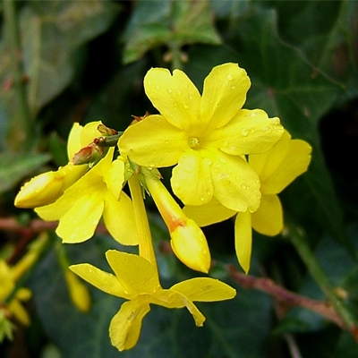 Многолетний декоративный кустарник с длинными поникающими слабо облиственными побегами с тонкими пониклыми ветвями и опадающими на зиму листьями. Листья мелкие, тройчатые, ярко-зеленые. Цветки яично-желтые, довольно крупные, появляются в пазухах листьев вдоль всего стебля с конца зимы и на протяжении всей весны на провисающих до земли ветвях. Именно поэтому жасмин голоцветковый называют «Зимним жасмином». В мягкие зимы в отдельные годы может зацвести в конце февраля — начале марта в солнечных, защищенных от ветра местах. Цветет ежегодно. Цветение длительное, приходится на первые весенние месяцы после зимы. Даже небольшие заморозки не повреждают цветки. При выращивании в открытом грунте, в первые годы молодому растению требуется укрытие на зиму. Хорошо смотрится на фоне темных хвойных деревьев и кустарников. В таких посадках его цветки светятся особенно ярко. В конце марта распускаются другие раннецветущие виды, такие, как морозник, анемоны, подснежники, крокусы или нарциссы, которые можно высаживать у подножья жасмина. Без опоры жасмин образует широкие низкие кусты. Соприкасающиеся с землей побеги легко пускают корни, поэтому его можно также использовать в качестве почвопокровной культуры. Для более обильного цветения побеги жасмина голоцветкового умерено подрезают каждые 2 — 3 года непосредственно после цветения. Почва любая, растение очень не требовательно. Местоположение должно быть защищенное от ветра и осадков, солнечное или слегка затененное