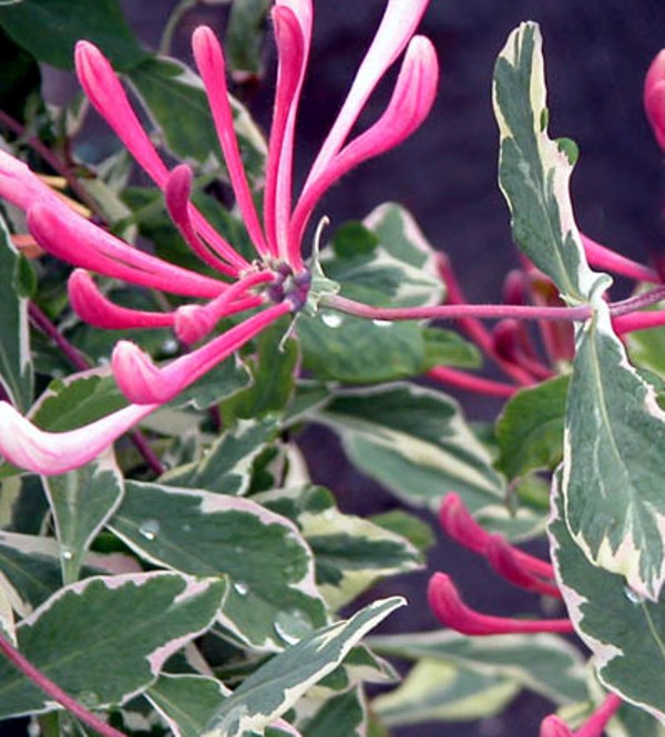Саженцы жимолости приморской Харклевин являются быстрорастущей лианой с нарядными листьями сине-зеленого цвета, окаймленные бело-розовой размытой каймой. Взрослая лиана достигает среднего размера порядка 60 см.